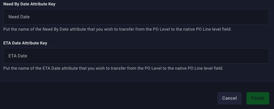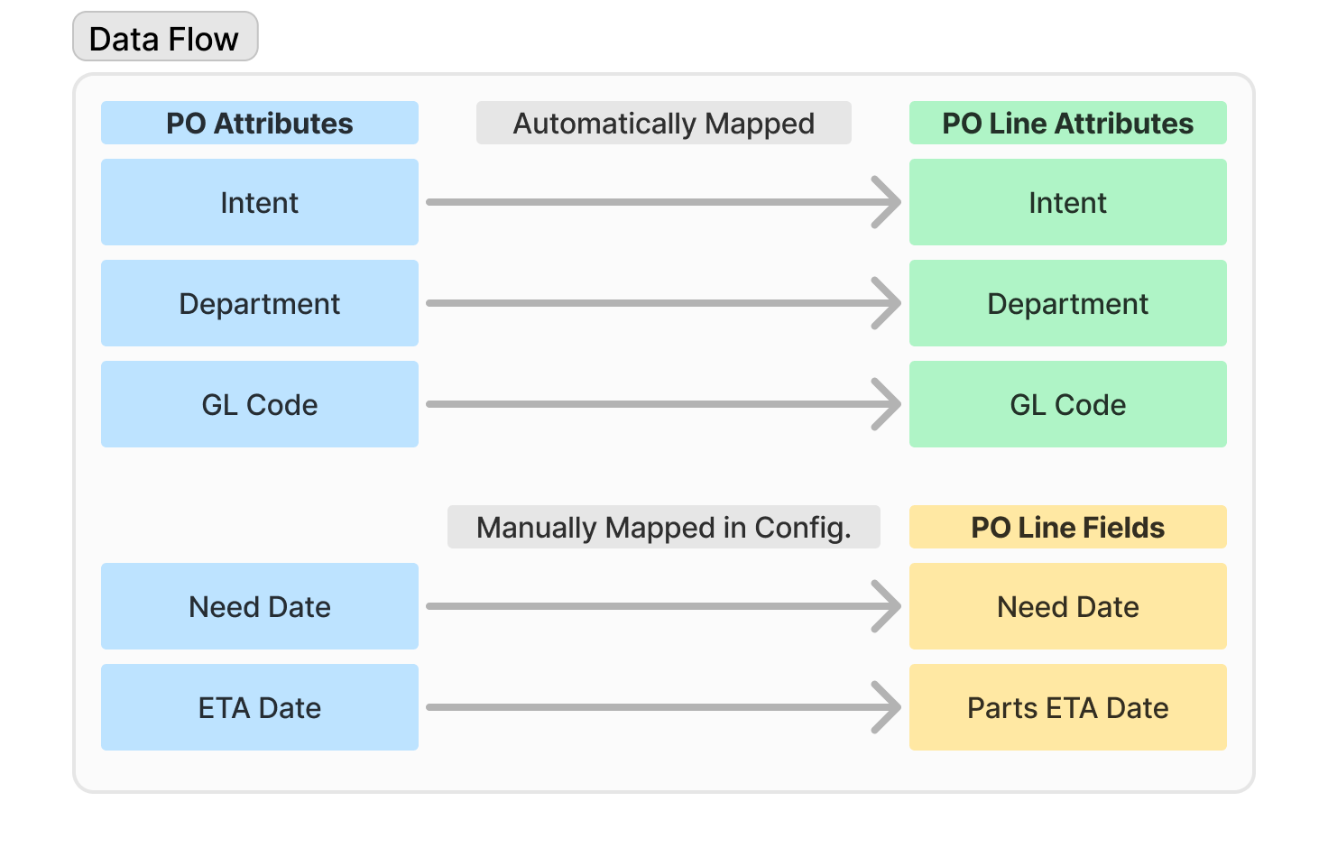 This automation allows you to map date-time attributes at the PO level to the native PO Line fields "Need Date" and "Parts ETA Date." During configuration, you can specify which PO attribute keys to map.