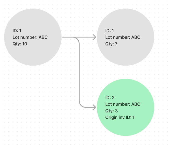 When splitting an inventory, the original inventory has its quantity decreased. A new inventory is then created for the quantity difference. This new inventory copies over nearly all of the properties from the original inventory. It also maintains a link to original inventory that is called `originPartInventoryId` in the API.