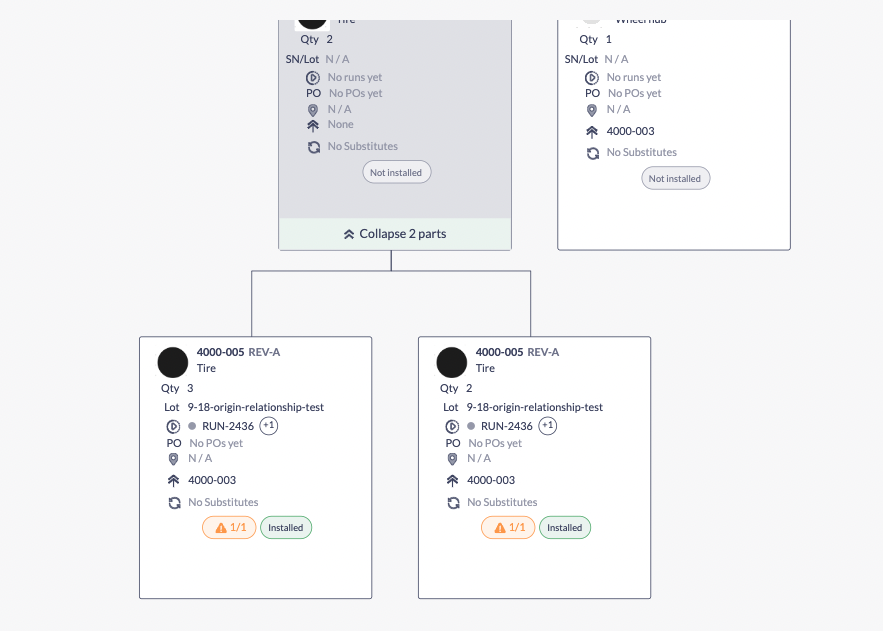 Inventory relates to a lot of different objects in ION: runs, kits, issues, purchase lines, etc. Runs and issues only allow 1 inventory item to be related to them. When an inventory that is tied to a run (or issue) is split, it will use the **origin part inventory** information to maintain a reference to the run/issue.