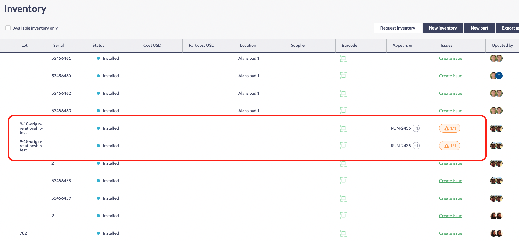 For the inventory items shown below, the inventory was added to a run and then there was an issue tied to it. When that inventory was split, the new inventory created maintains a reference to both the run and the issue (see "Appears on" and "Issues" columns).