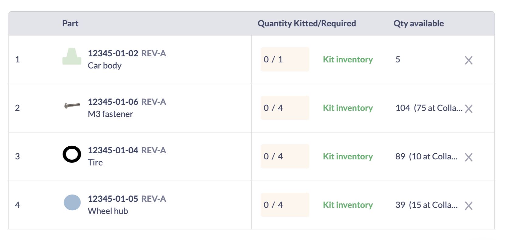 This kit was generated from the same mBOM as above. Notice how the wheel assembly is not an item, but the tire and wheel hub parts are.