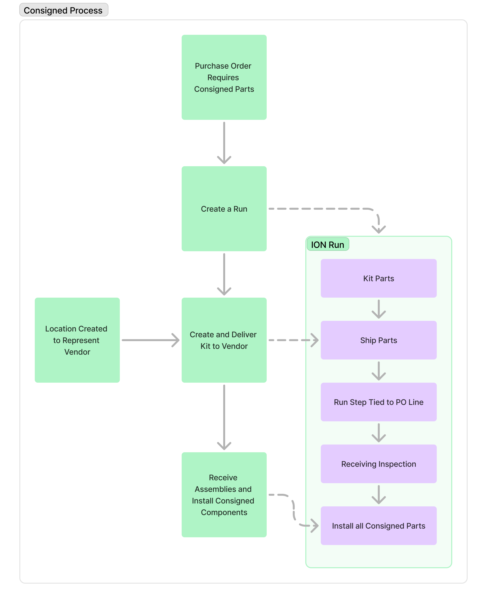 In ION, we can tie together, Purchases, Runs, and Kits to ensure your vendors receive the consigned parts and they are installed on to the aBOM of your assembly once received. Check out the flow below on the details of the process.