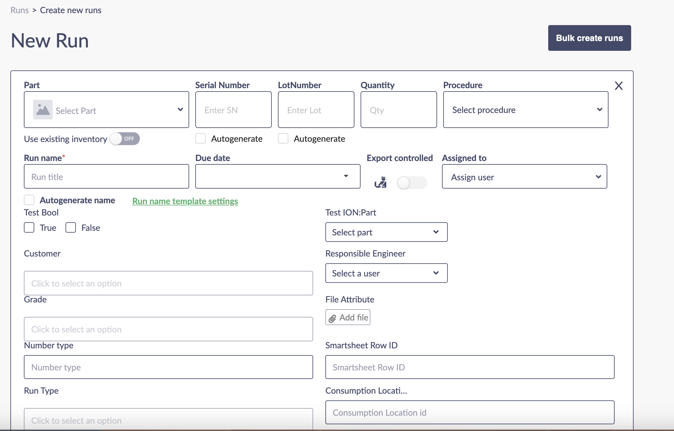 You can also use the **Bulk create runs** button to create runs in bulk from an Excel sheet or CSV file.