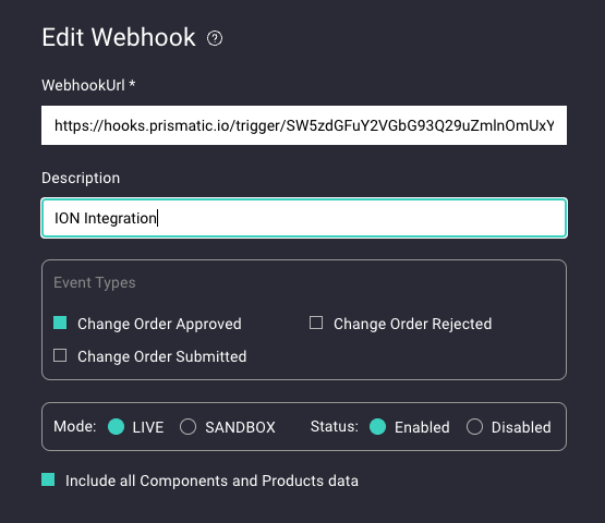 10. The last step is creating a Duro webhook that sends data to ION when a change order is approved. Navigate to the webhook page in settings and create new one. You can populate the URL with the URL you captured in the previous step. Fill out the remaining details as seen below.